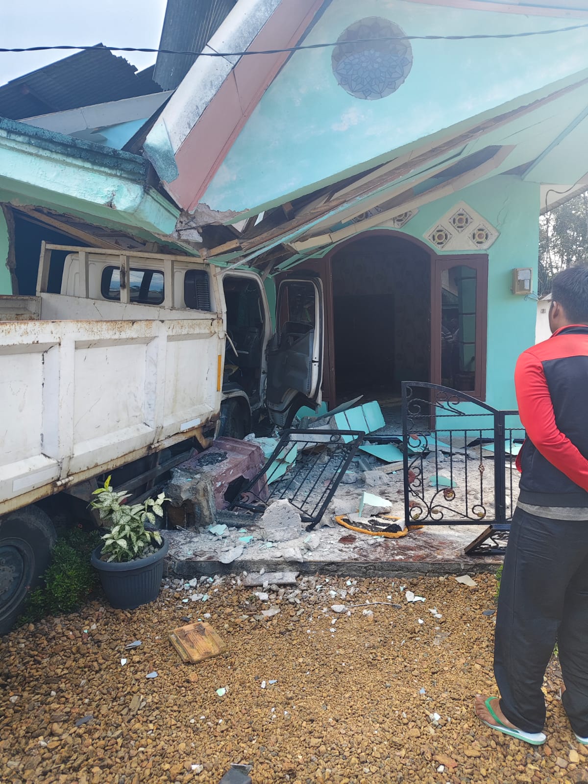 Sementara itu, kondisi rumah warga yang ditabrak mengalami kerusakan cukup parah di bagian depan. Beruntung, tidak ada korban jiwa dalam peristiwa tersebut, namun kerugian material diperkirakan cukup besar.